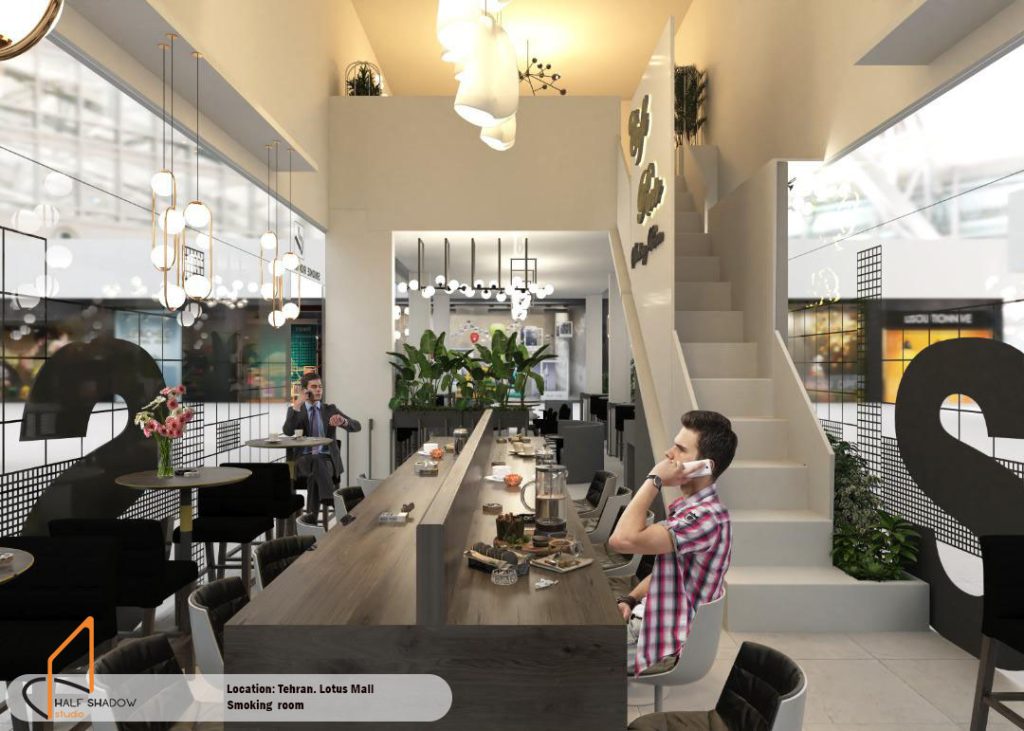 کافه سیگار مجتمع تجاری لوتوس مال در فضایی به ابعاد 50 متر مربع با ایجاد نیم طبقه طراحی شد.کافه سیگار در فضای مرکزی مجتمع در نزدیکی کافه واقع شده تا دسترسی مراجعین به فضای کافه سیگار به راحتی انجام گیرد.طراحی فضایی به عنوان فضای مکث مابین فضاهای حرکتی مجتمع خودنمایی می کند.هدف طراحی ایجاد ارتباط و نزدیکی غیرمستقیم مابین فضای کافه سیگار و فضاهای اطراف بود که برای رسیدن به این هدف از مواردی چون نورپردازی و طراحی بدنه های شیشه ای در راستای ایجاد ارتباط بصری غیرمستقیم بهره بردیم.